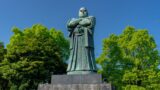 西郷隆盛像と緑に囲まれた公園の風景 交通