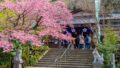 満開の寒緋桜が参道を彩る薩摩川内市の新田神社